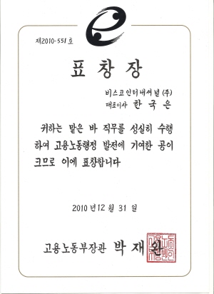 지난해 2월 한국기술교육대학교 테크노 인력개발대학원에서 박사 학위(인력개발 전공)를 받은 한국은 동문(비스코인터내셔날(주) 대표이사)이 2010년 12월 31일 ‘고용서비스 우수기관인증’ 평가위원으로서 활동하면서 고용노동행정에 기여한 공로로 고용노동부 장관상을 받았다.