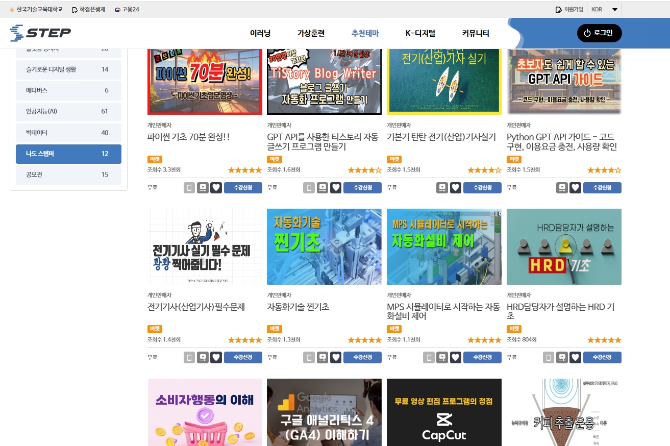 한국기술교육대학교(KOREATECH·총장 유길상) 온라인평생교육원이 고용노동부와 함께 운영하는 스마트직업훈련플랫폼(STEP)에 일반인, 재직자 등이 제작해 업로드 한 학습 콘텐츠가 인기몰이를 하고 있다.