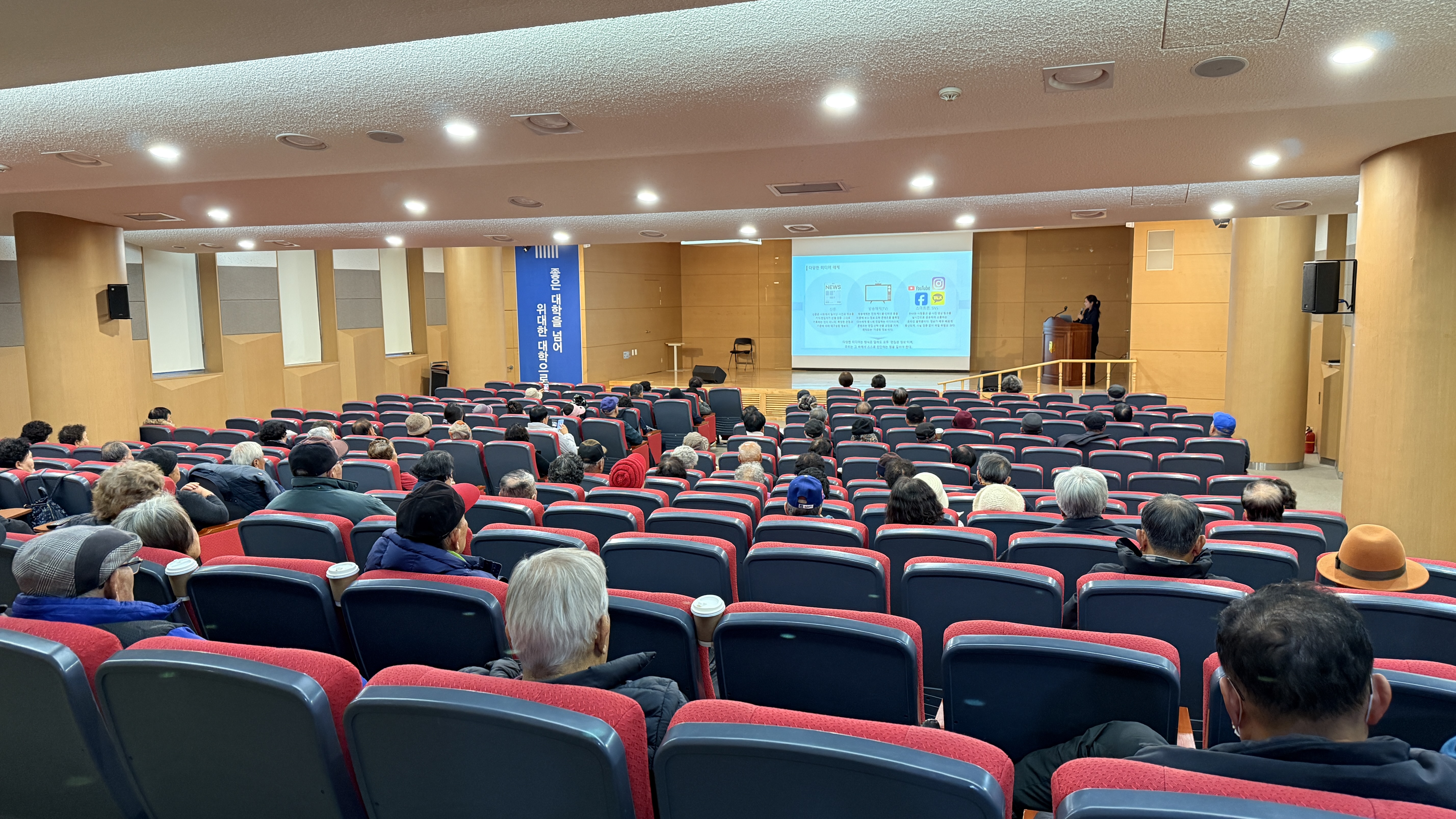 대학 인근 식당에서 점심 식사를 한 후, 본교 다산정보관 다산홀로 이동해 디지털 문해력이 낮은 어르신을 대상으로 ▲가짜뉴스 구별 법 ▲일상생활에서 필요한 디지털 정보 활용법 등 실생활 기반 디지털 리터러시 교육을 제공해 큰 호응을 얻었다. 이어 실화를 바탕으로 한 가족영화 ‘담보’를 함께 관람하며 따뜻한 소통과 공감의 시간을 나눴다.